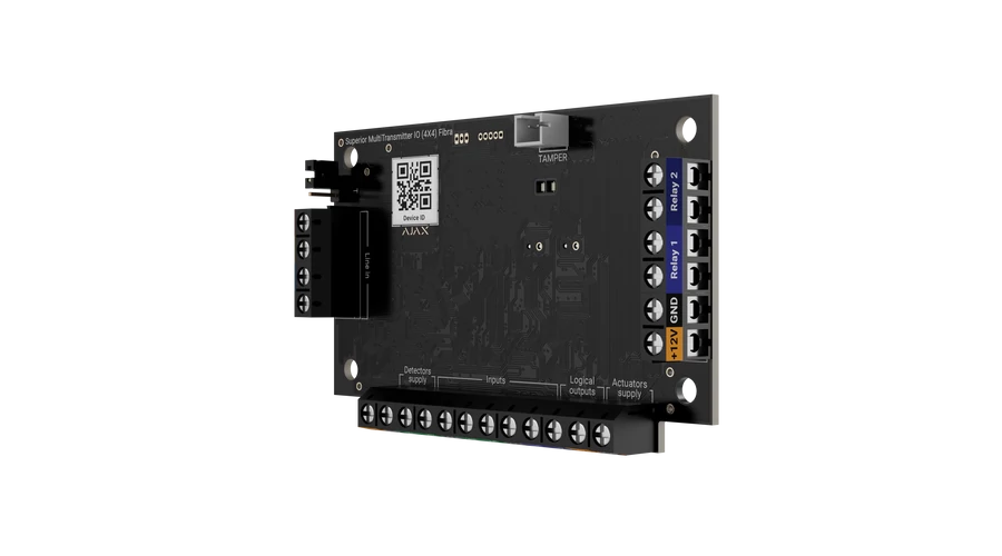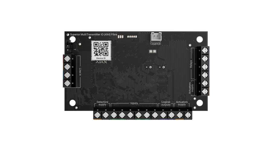 A Superior MultiTransmitter IO (4×4) Fibra lehetővé teszi, hogy harmadik féltől származó eszközöket is bekapcsolj az Ajax ökoszisztémába. Négy bemenetén keresztül fogadja a csatlakoztatott érzékelők jelzéseit, míg négy kimenetével különféle berendezéseket – például zárakat, blokkoló elemeket vagy szirénákat – vezérelhet.